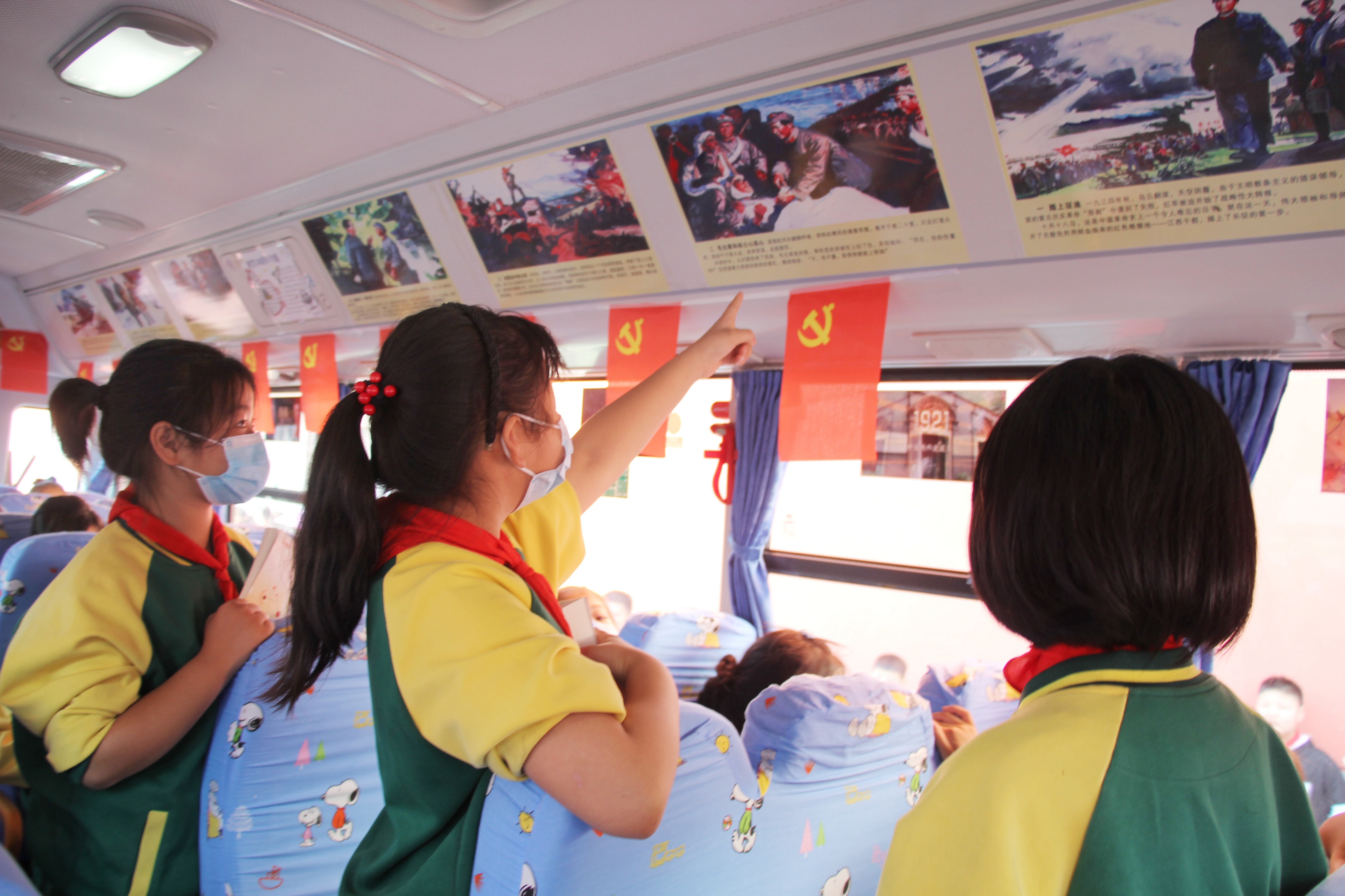 为了进一步推进校车主题车厢的建设,连汽灌云欣达校车在沂北中心小学打造苏GV7359党史教育示范车,学生在乘车上下学过程中,一边乘坐校车一边听照管员讲解党史知识,照管员细致的讲解让孩子们对党史学习产生了浓烈的兴趣。