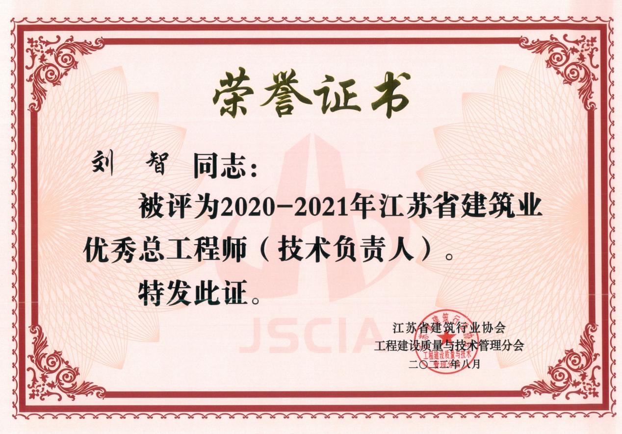 近日,江苏省建筑行业协会《关于发布2020-2021年江苏省建筑业优秀总工程师(技术负责人)评价结果的通知》(苏建质协[2022]11号)获悉江苏海建公司总工程师刘智同志被评为2020-2021年度江苏省建筑业优秀总工程师。据悉,连云港市共有五人获得该荣誉。