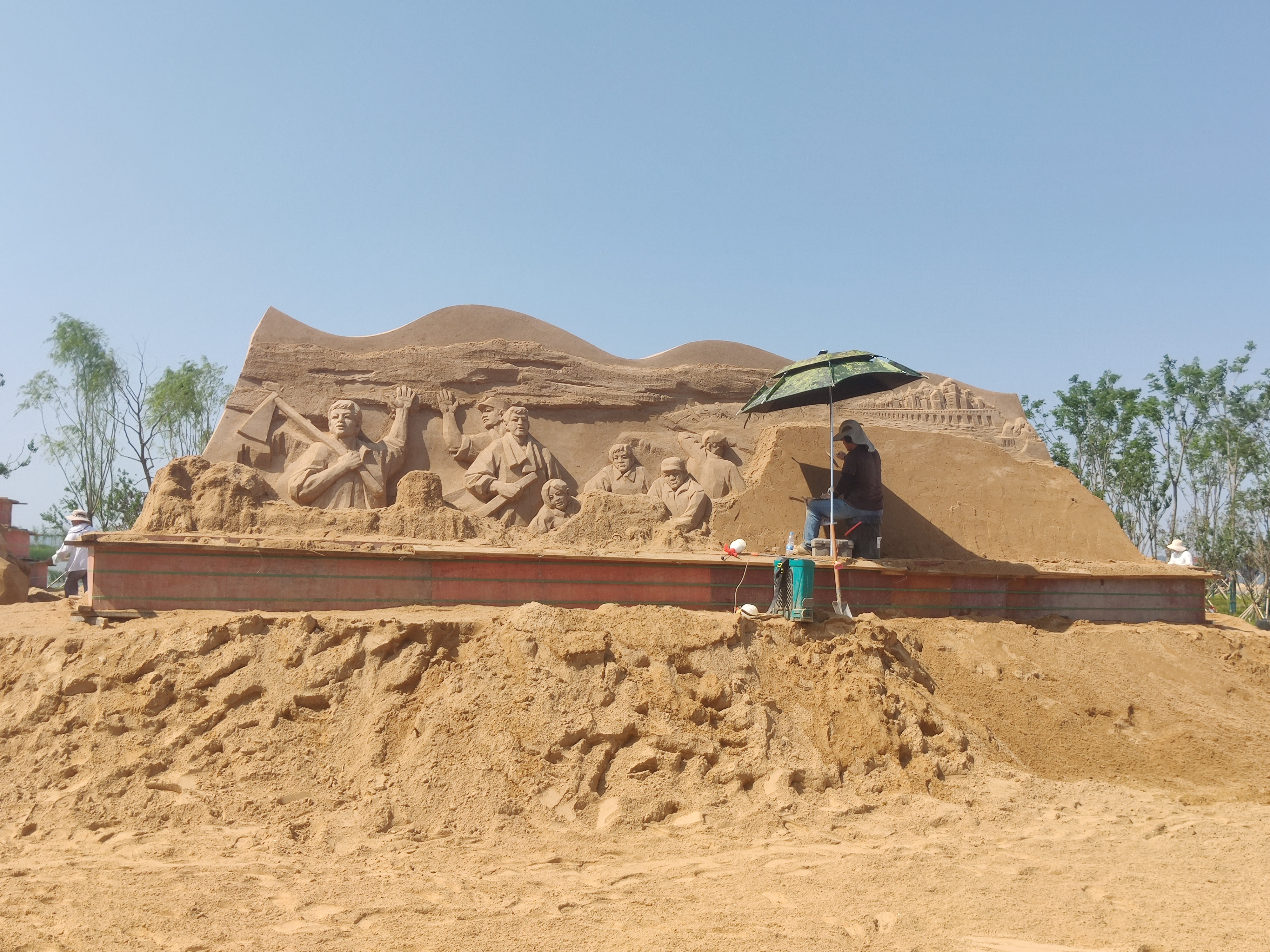 六月初夏,骄阳下的黄金沙滩多了一批沙雕工作者。他们正竭尽全力通过堆、挖、雕、掏等方式将沙子塑成各种造型来供游人观赏。