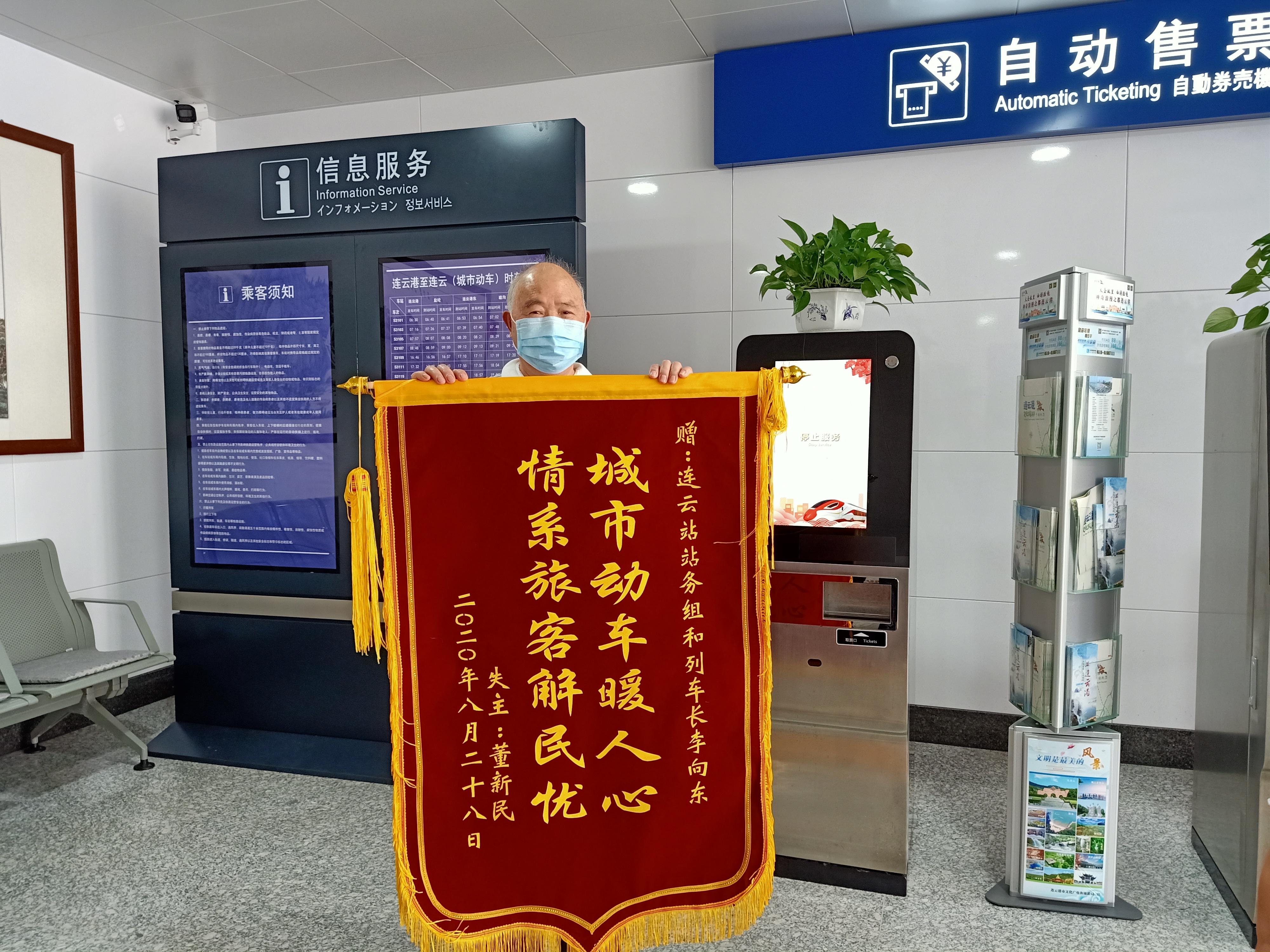 8月28日下午,一位大爷带着孙子乘坐城市动车去连云景区游玩。新颖独特、舒适整洁的车厢一下吸引了小朋友的注意力,小朋友兴奋万分,大爷也感叹城市的发展速度并由衷的高兴,以至于到达连云站下车时,把小挂包丢在了车上。过了十几分钟后,才发现包没在身上,大爷立马赶回车站向工作人员寻求帮助。可是当时车已经发车走了,大爷十分着急,因为包里有身份证、驾驶证、银行卡等重要证件,还有2000多元现金。得知情况后,连云站值班站长孙晓婷及客运接车人员杭从明紧忙联系当班列车长李向东。得知此事后,列车长立马寻找挂包,座椅的边边角角都找了一遍,果然在后排座位上找到了挂包。他立刻联系站务员告知包已经找到,听到这个好消息后,大爷悬着的心终于落地了,高兴地说“谢谢你们所有工作人员,如果不是你们的热心帮助,我的包也不会在这么短的时间内找到!”站务员及客运接车员连忙回道:“这都是我们应该做的,能帮助到您是我们最大的快乐。”