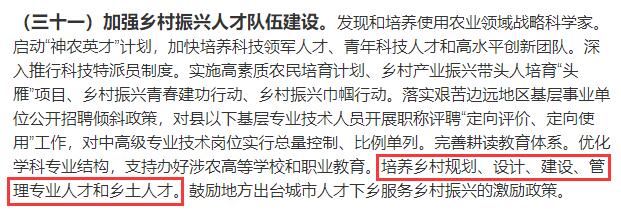 在加大政策保障和体制机制创新力度部分,文件提出:培养乡村规划、设计、建设、管理专业人才和乡土人才。