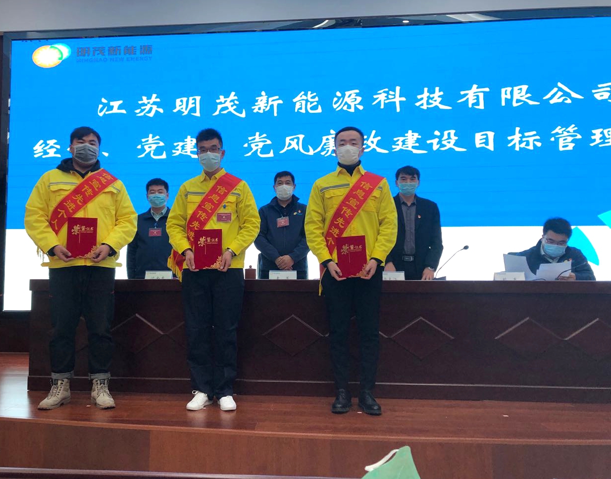 下午14时,明茂新能源科技有限公司一届一次职工代表大会在庄严的国歌声中开幕,明茂公司副总经理、工会筹备组组长沈金虎作明茂公司工会成立筹备工作汇报。会议听取并通过了明茂公司总支书记、总经理袁军同志的《2019年度总结暨2020年计划工作报告》,明茂公司财务部部长蒋月琴的《2019年度财务决算及2020年度财务预算报告》,综合办公室主任的《江苏明茂新能源科技有限公司薪酬方案》,递交了《集体合同》、《经营目标责任书》,副总经理沈金虎同志宣读并表彰了在2019年度工作突出成绩优异的优秀管理者和先进个人。
