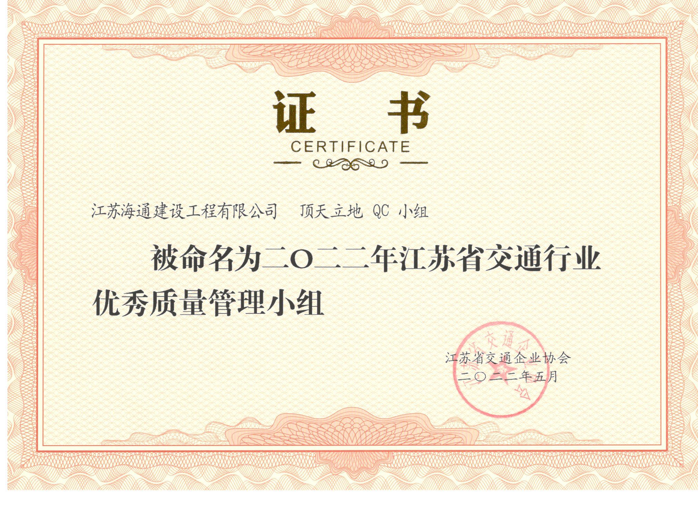 近日,江苏省交通企业协会在南京召开了2022年度江苏省交通运输行业优秀QC成果发布会,会上颁发了2022年江苏省交通行业优秀质量管理小组奖状,同时对择优选出的QC成果现场发布进行了评奖。江苏海建公司顶天立地QC小组和金海二桥QC小组被评为2022年江苏省交通行业优秀质量管理小组。顶天立地QC小组及成果《提高路缘石拆除利用率》获得2022年优秀QC小组活动成果二等奖。