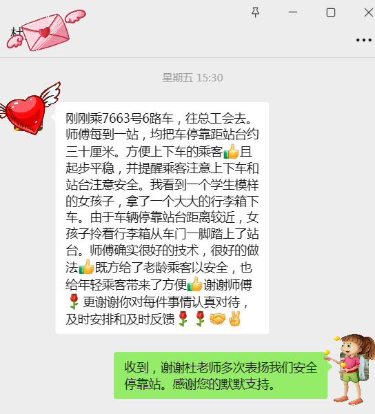 10月24日下午三点,市民杜老先生乘坐6路公交车前往市总工会时,被驾驶员武传斌的细心服务深深打动。他特意发消息至公交集团权属海通公交公司一名职工的手机上,称赞道:“这位师傅开车特别稳,每到一站都会将车停得离站台特别近,上下车方便又安全!”