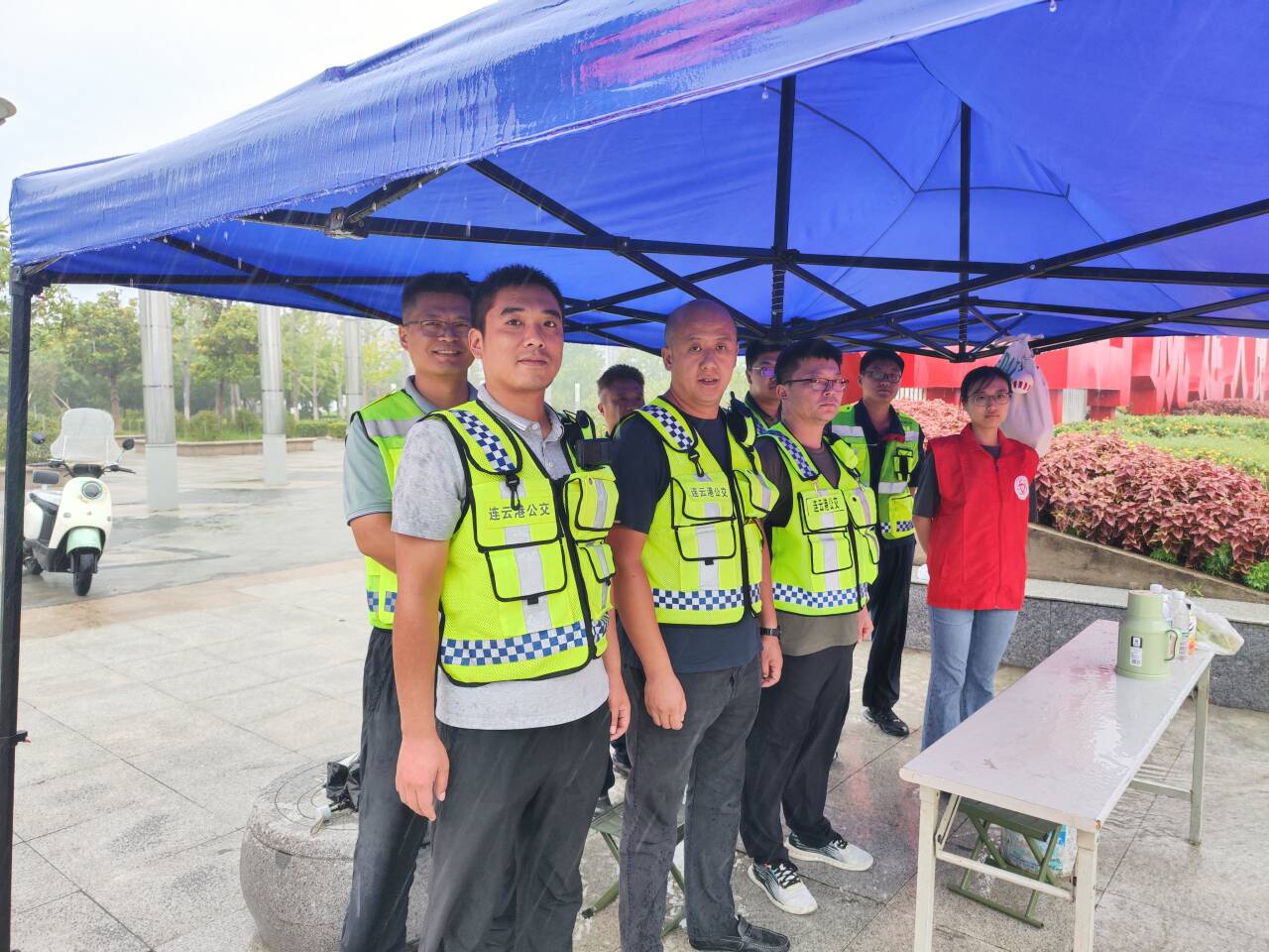 本轮比赛市区遇强降雨天气,多条道路积水严重,整个公交接驳运输工作安全压力增大。公交集团严阵以待,在既定保障方案基础上,立即启动恶劣天气应急预案,进行风险源点再排查、行车安全再提醒。风雨最大处,正是岗位坚守时,在各大枢纽站和“苏超”保障接驳点,百余名志愿者构成了一道动人的风景线,他们虽身穿雨衣,但衣裳早已湿透,分不清是雨水还是汗水;他们的声音在风雨中显得有些嘶哑,却依旧清晰有力:“足球专线往这边走!”“去体育中心的在这里上车!”他们的身影不停穿梭在车流人海中,引导车辆停靠,耐心指引乘客,时而为携带行李的旅客撑起雨伞。各接驳点位,“公交先锋志愿服务队”搭建起了临时避雨棚,设立志愿服务点,为乘客提供遮风避雨的场所、饮用水等,用心服务每一位乘客出行。