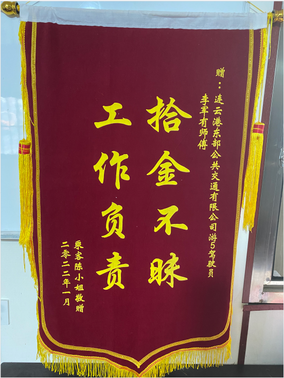 1月9日上午,陈女士冒着严寒送来了锦旗,她解释说:“不好意思了,最近忙,没有及时将锦旗送来,今天周末有空才来送,太感谢驾驶员李军有师傅了,他的拾金不昧精神值得大家好好学习。”锦旗上“拾金不昧 工作负责”是对李军有师傅的最美赞扬,让这份正能量传递至港城大地。
