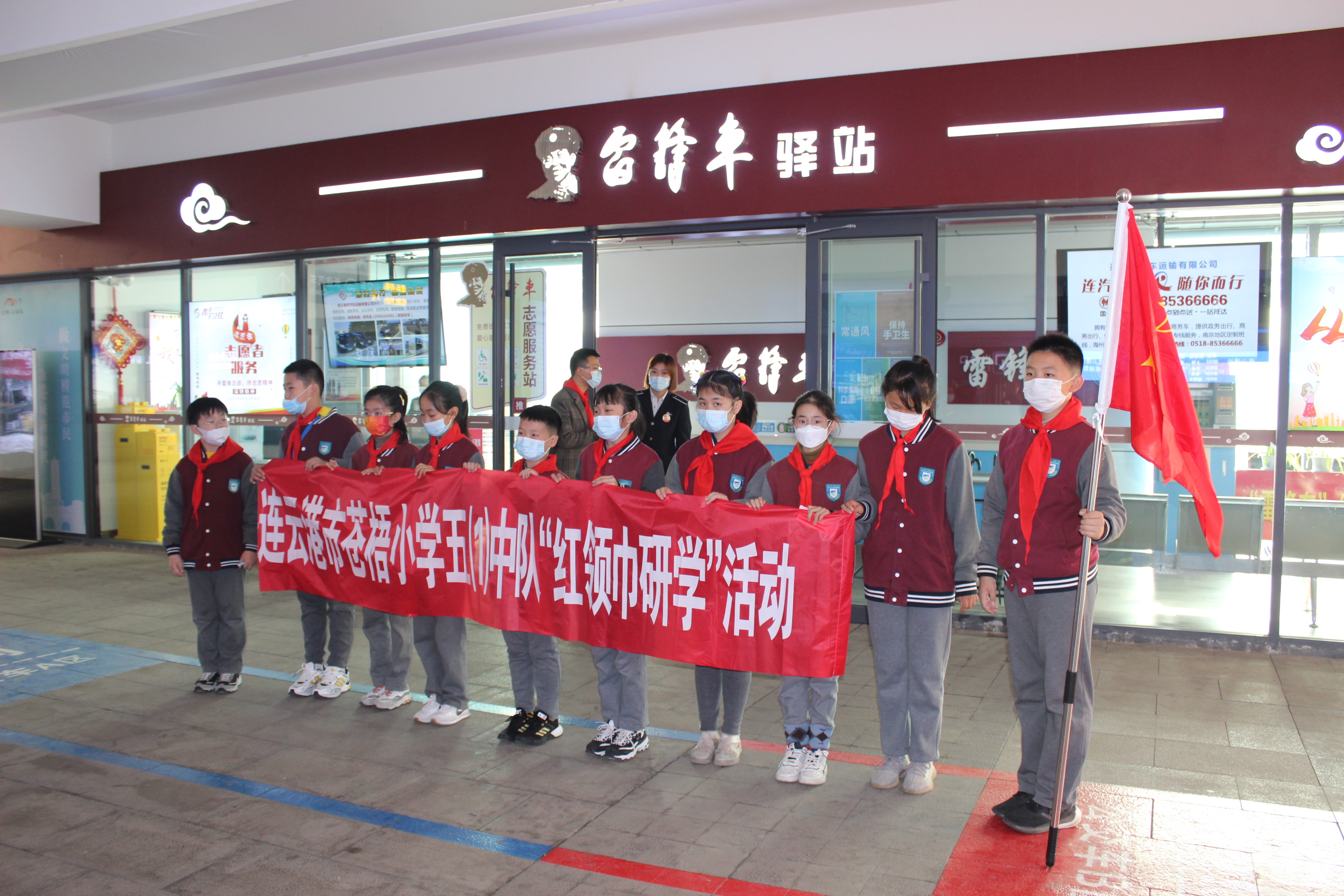 最后,同学们在驿站门前拉起《连云港市苍梧小学五(1)中队“红领巾研学”活动》横幅,拍照留念。